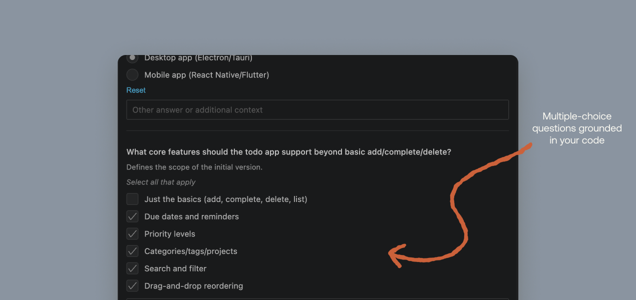Without explicit guidance, coding agents make a lot of assumptions. They don’t ask questions when they don’t understand what you need, so they build features that don’t align with your vision and leave you with messy code you’ll need to clean up. This makes it much harder to use agents for complex tasks, since you’re often stuck throwing away code, re-prompting, and babysitting them to make sure they build what you actually want.
