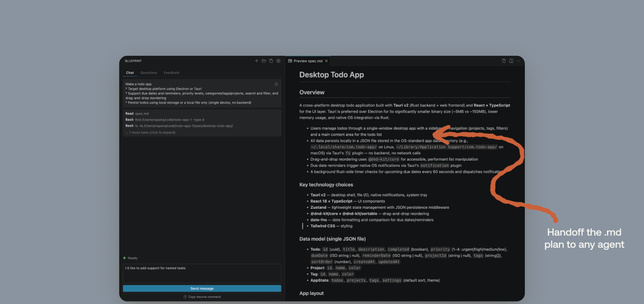 “[Blueprint] is strictly better. The problem with Claude Code Plan Mode is that it asks you questions to check the box, not thinking super hard about it. This is like a smarter, better, deeper way of actually making the plan, which matters when the plan is large.”