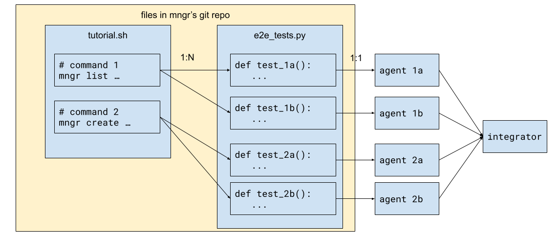 - Tutorial blocks tend to be concise and sometimes a bit contrived, but we want tests to be more exhaustive, covering both happy and unhappy paths. So this is a 1:N correspondence: for the same tutorial block, we can expect slight variations of the command itself or the environment to result in different outcomes, and they often deserve separate test cases.