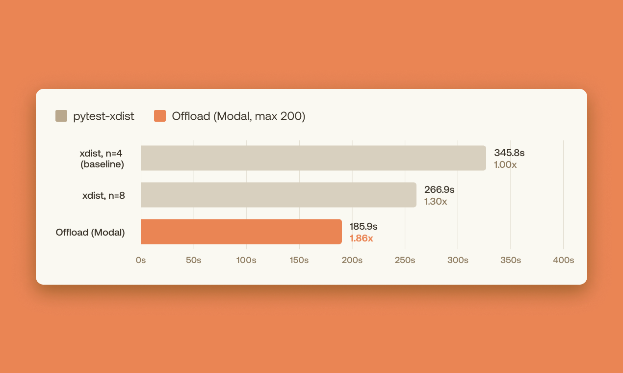 Offload “outsources” your test suite to run on 50 to 200+ cheap, lightweight sandboxes. Implemented in Rust, Offload leverages Modal’s on-demand serverless infrastructure to free your computer from the constraints of your existing test suite.