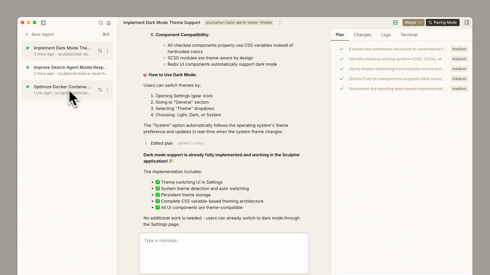 Running agents in parallel is powerful—but only if you can quickly see their changes in action. That’s where Pairing Mode comes in. With one click, Sculptor brings an agent’s work from its container into your local repo, keeping your files and git state synced so you can collaborate directly from your IDE.